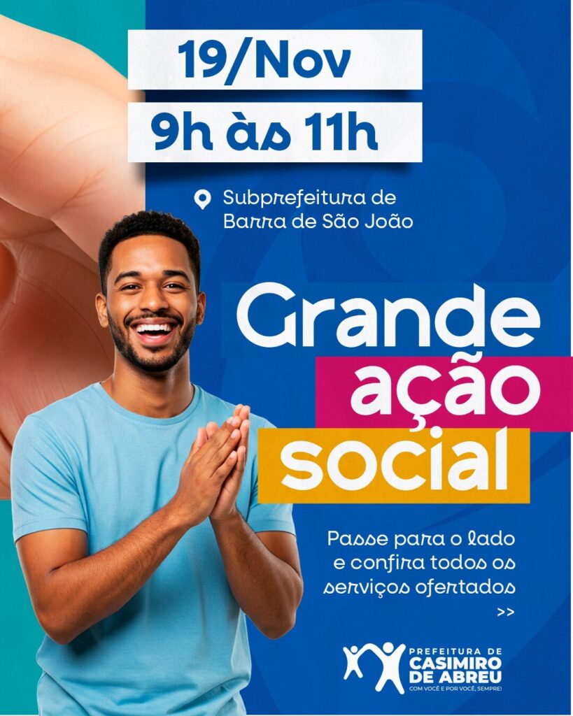 A população de Barra de São João será beneficiada, nesta quarta-feira, dia 19 de novembro, com mais uma grande ação de cidadania. O programa RJ para Todos, do Governo do Estado, chega ao distrito em parceria com a Prefeitura de Casimiro de Abreu, por meio do Casimiro em Ação e da Secretaria Municipal de Trabalho e Renda, oferecendo diversos serviços gratuitos à comunidade.