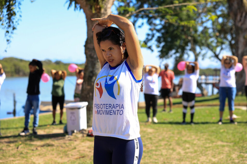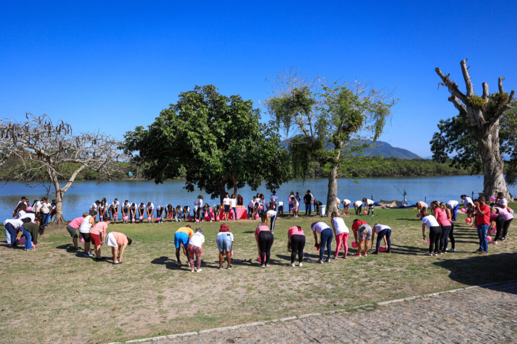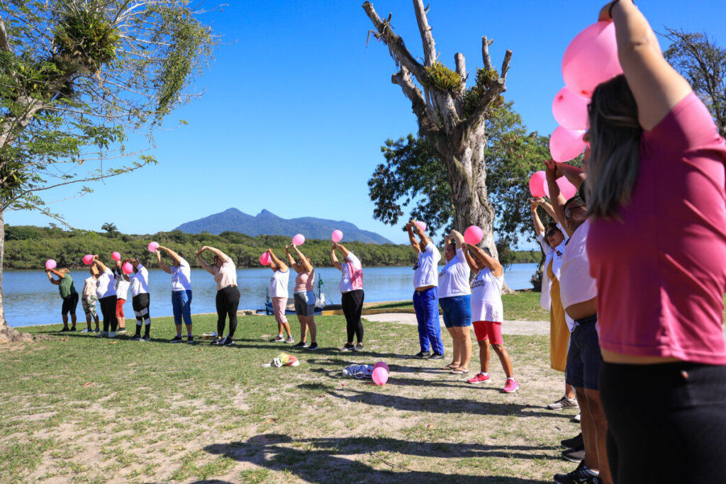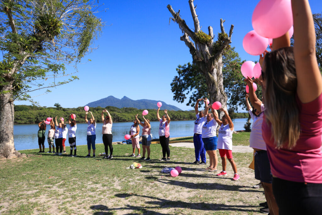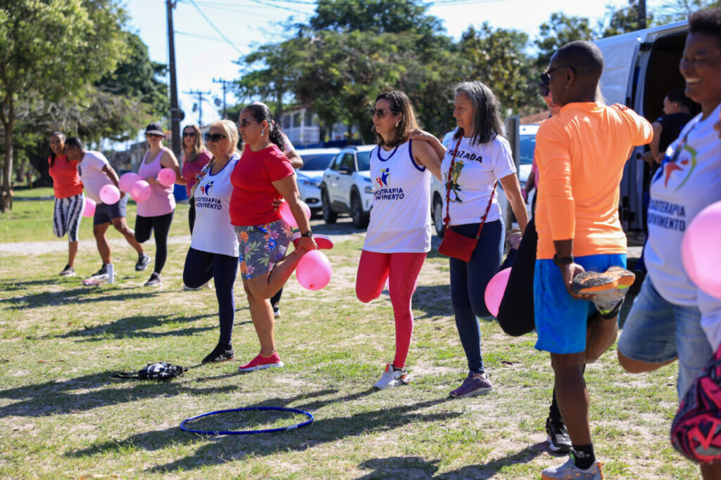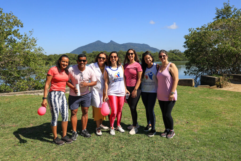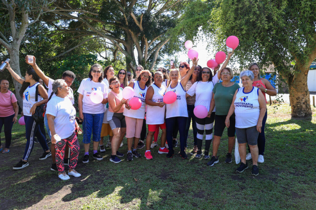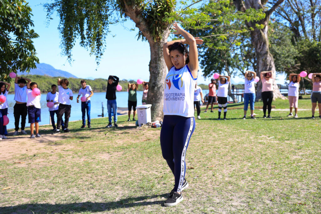 Com café da manhã e a bela vista do morro São João, às margens do rio que dá nome ao distrito, os participantes do Projeto Fisioterapia em Movimento e alunos do Colégio Estadual localizado em frente à praça As Primaveras tiveram um momento de atividade física, interação com a natureza e orientações sobre o câncer de mama.