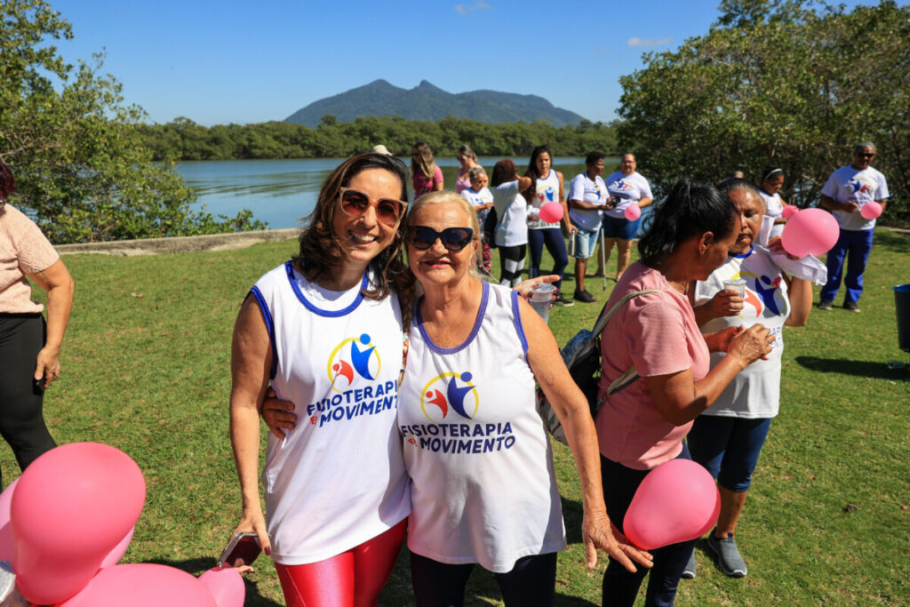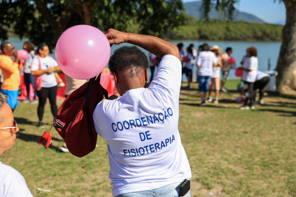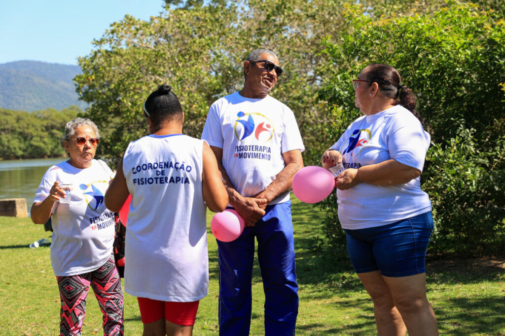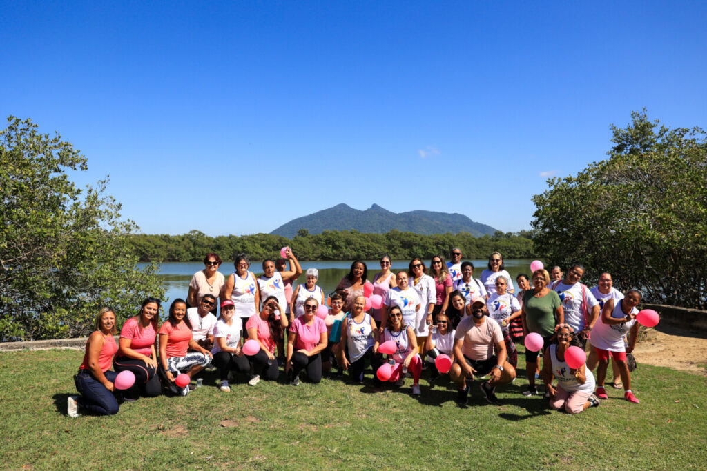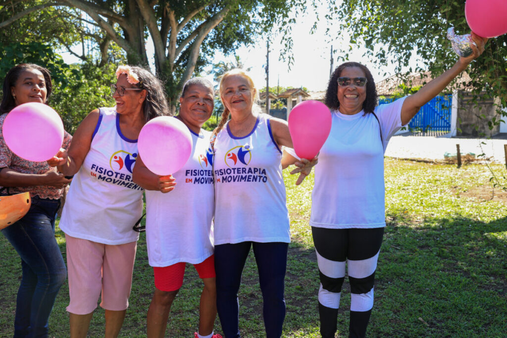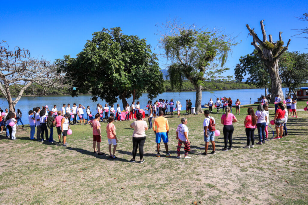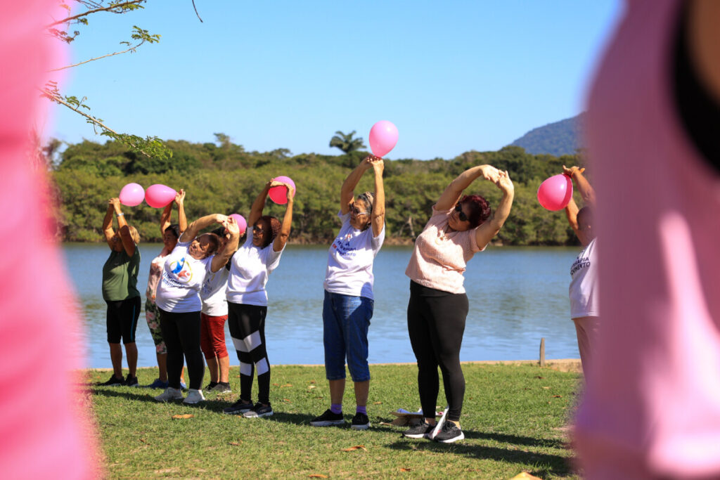 Com café da manhã e a bela vista do morro São João, às margens do rio que dá nome ao distrito, os participantes do Projeto Fisioterapia em Movimento e alunos do Colégio Estadual localizado em frente à praça As Primaveras tiveram um momento de atividade física, interação com a natureza e orientações sobre o câncer de mama.