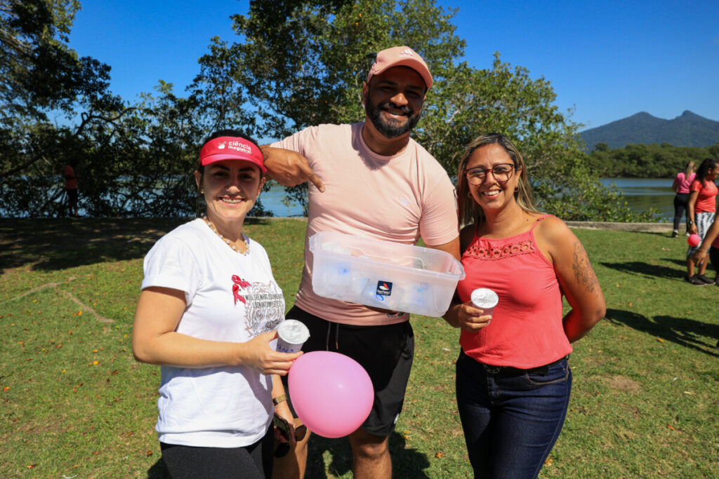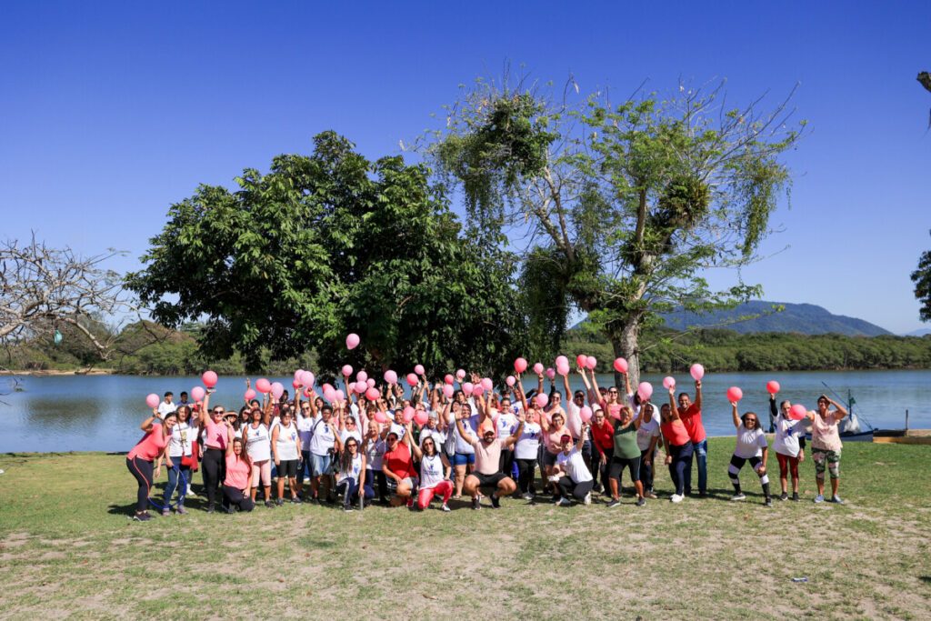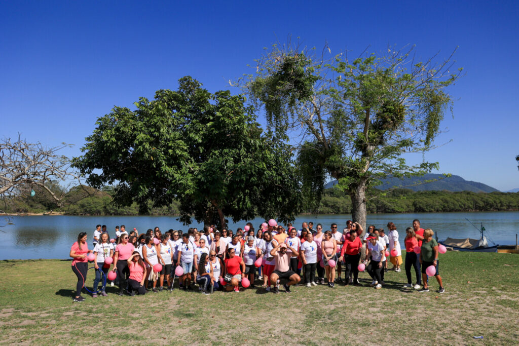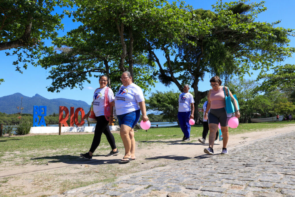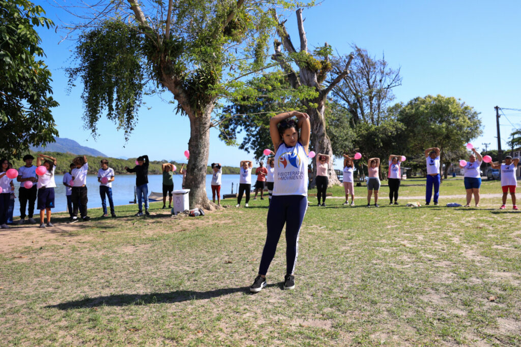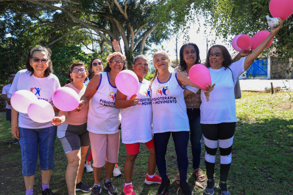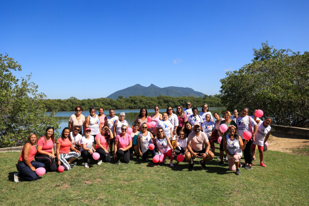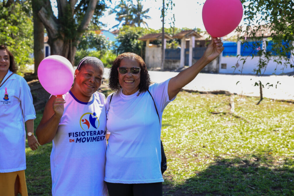 Com café da manhã e a bela vista do morro São João, às margens do rio que dá nome ao distrito, os participantes do Projeto Fisioterapia em Movimento e alunos do Colégio Estadual localizado em frente à praça As Primaveras tiveram um momento de atividade física, interação com a natureza e orientações sobre o câncer de mama.
