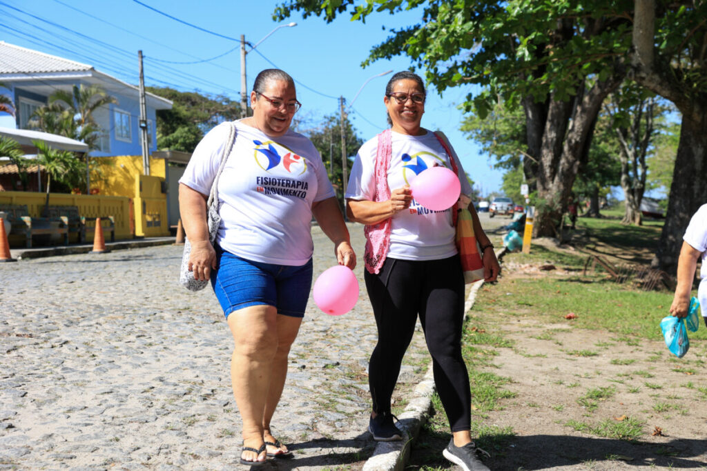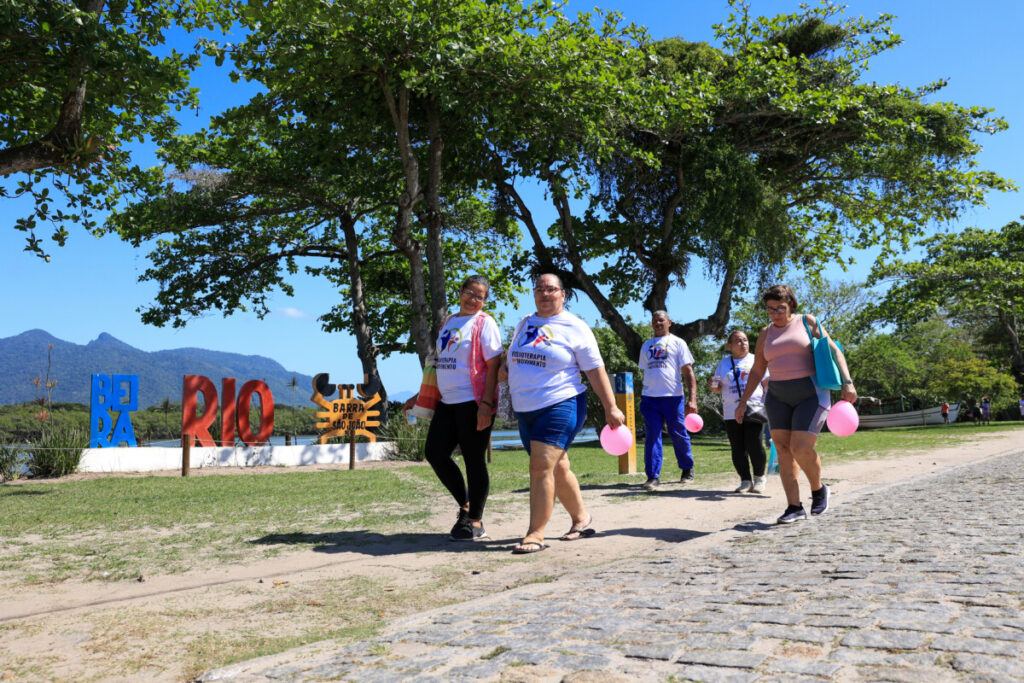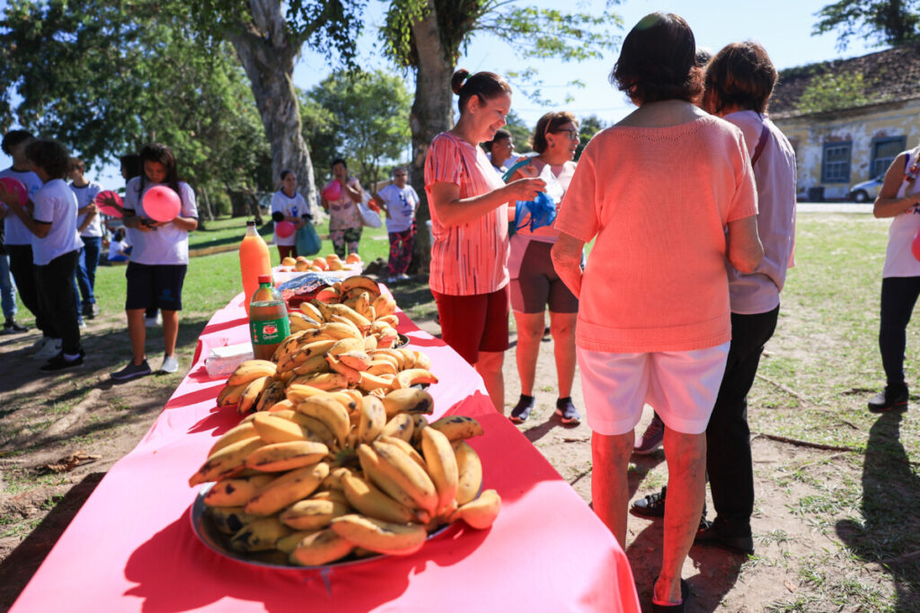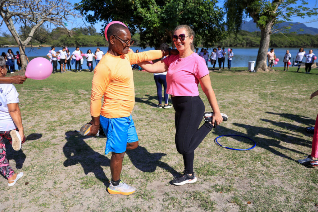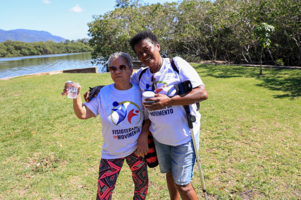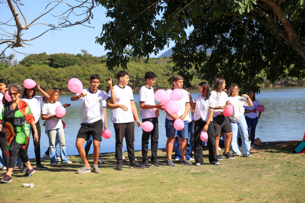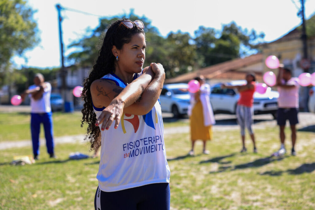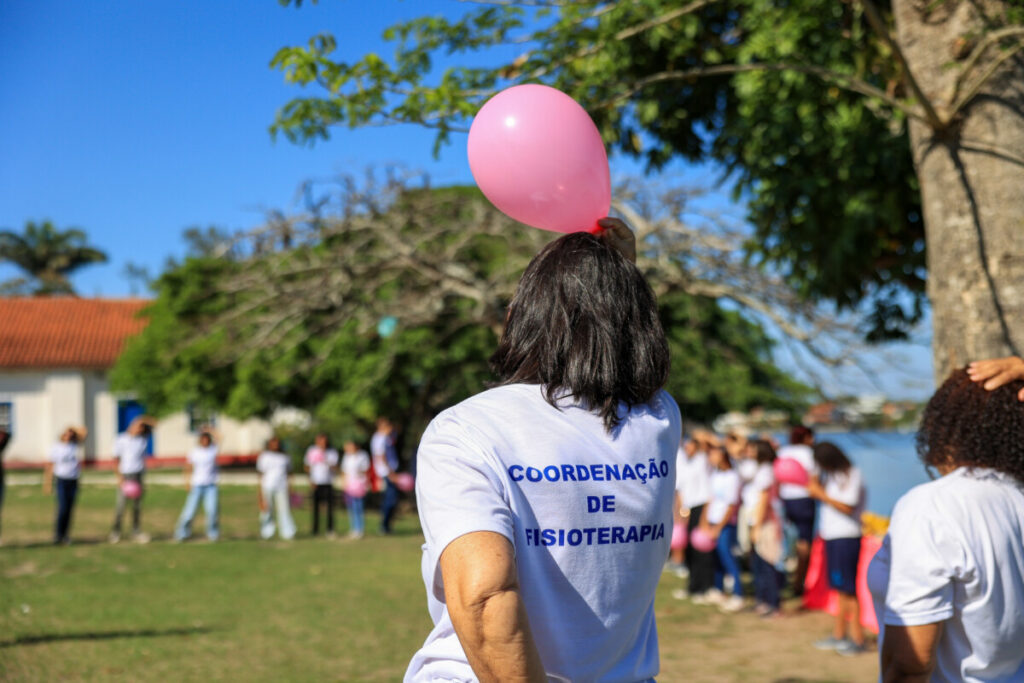 Com café da manhã e a bela vista do morro São João, às margens do rio que dá nome ao distrito, os participantes do Projeto Fisioterapia em Movimento e alunos do Colégio Estadual localizado em frente à praça As Primaveras tiveram um momento de atividade física, interação com a natureza e orientações sobre o câncer de mama.