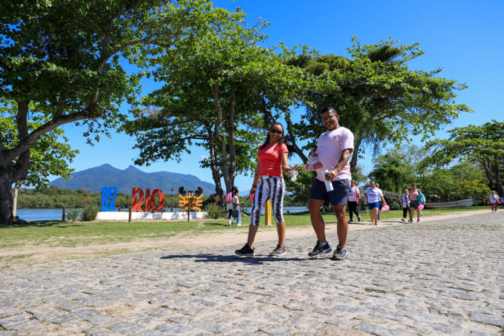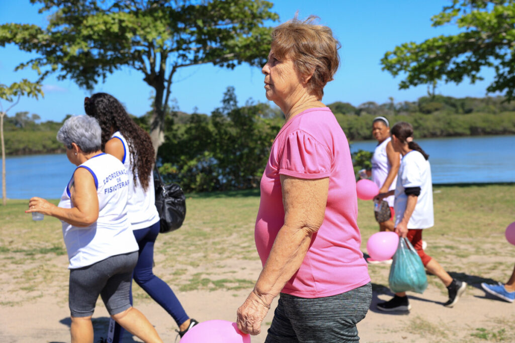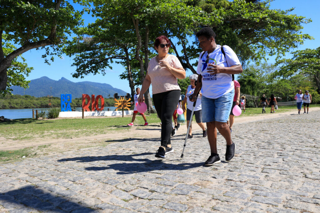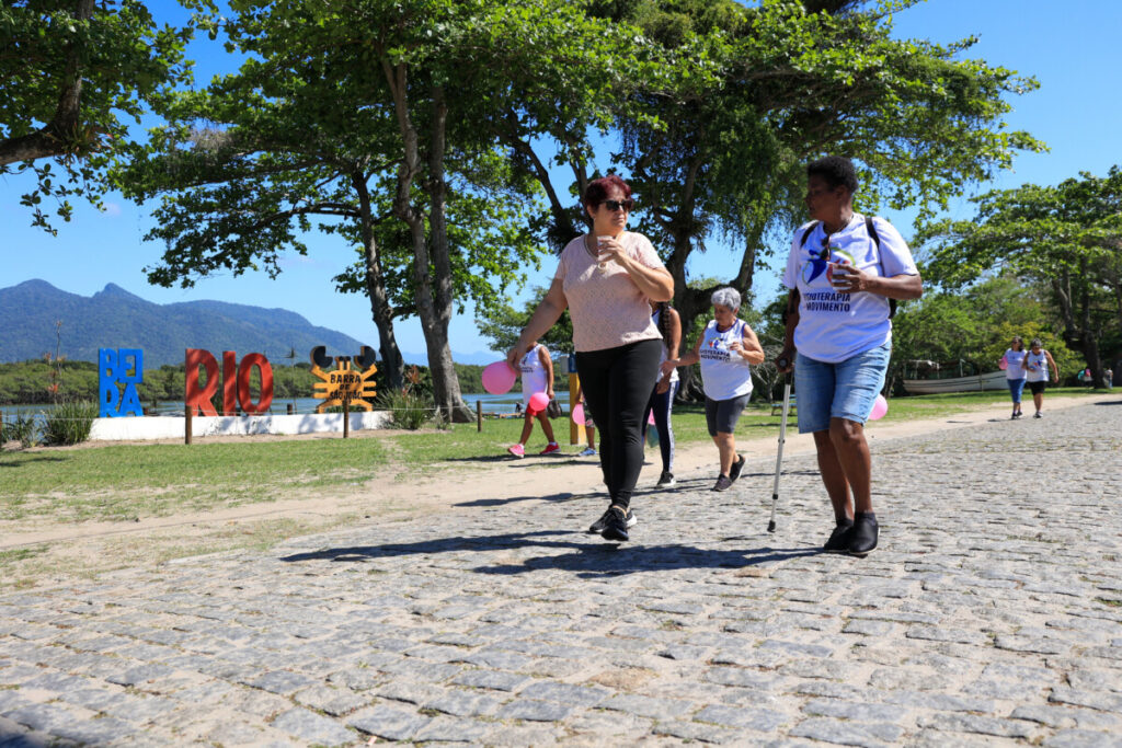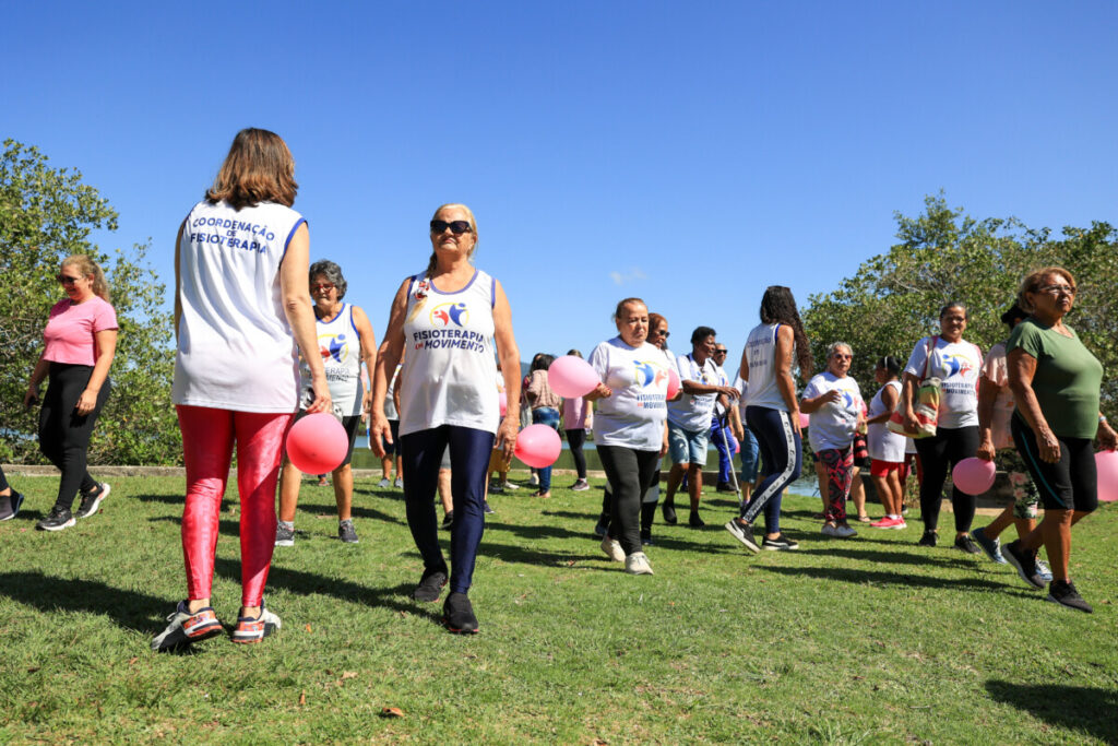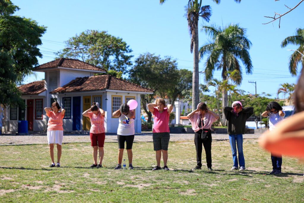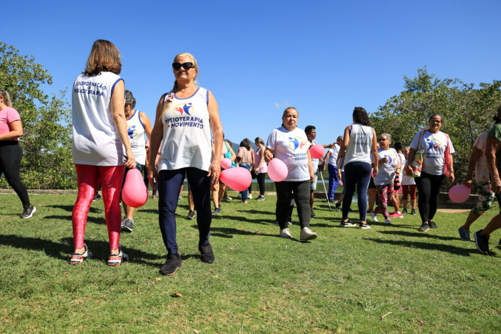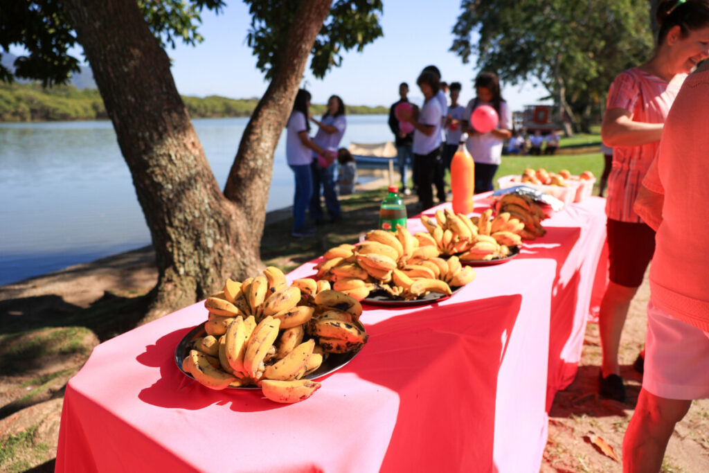 Com café da manhã e a bela vista do morro São João, às margens do rio que dá nome ao distrito, os participantes do Projeto Fisioterapia em Movimento e alunos do Colégio Estadual localizado em frente à praça As Primaveras tiveram um momento de atividade física, interação com a natureza e orientações sobre o câncer de mama.