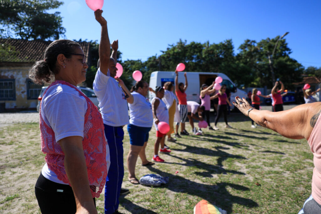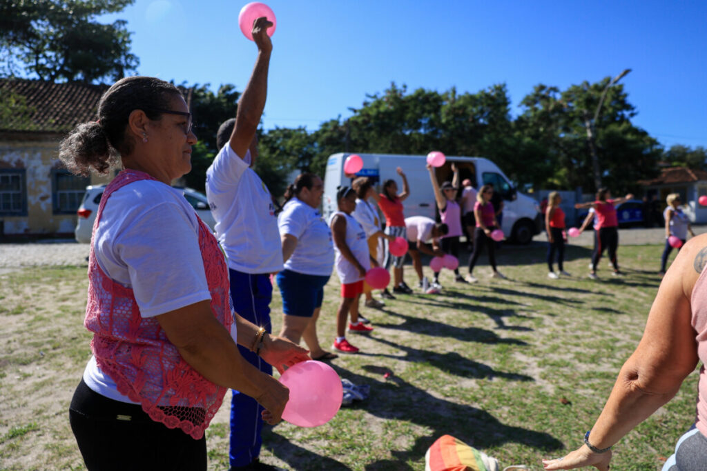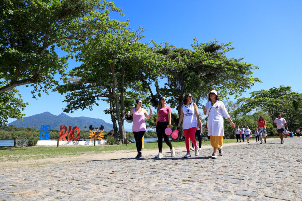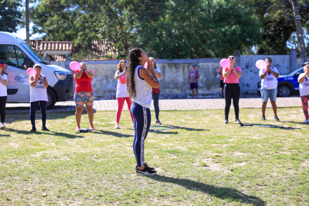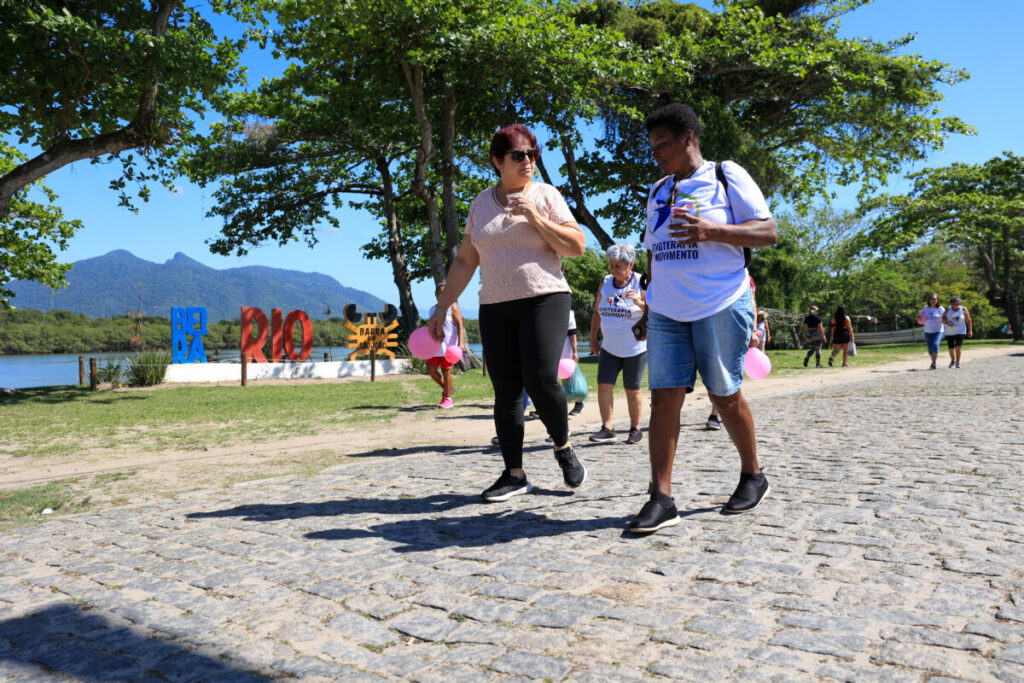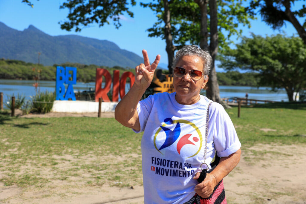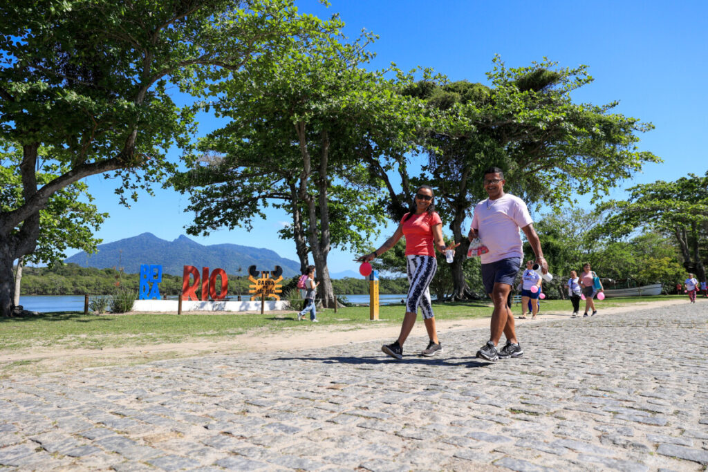 Com café da manhã e a bela vista do morro São João, às margens do rio que dá nome ao distrito, os participantes do Projeto Fisioterapia em Movimento e alunos do Colégio Estadual localizado em frente à praça As Primaveras tiveram um momento de atividade física, interação com a natureza e orientações sobre o câncer de mama.