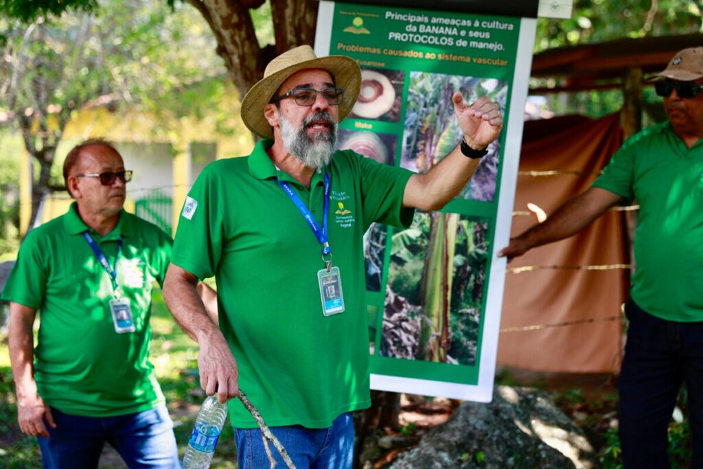 O coordenador estadual de educação fitossanitária, Leandro Machado explicou na prática como os produtores podem evitar a proliferação de doenças nos seus bananais