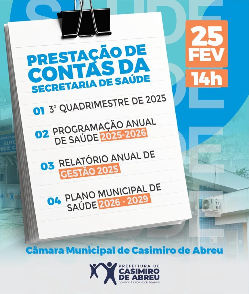 A Secretaria Municipal de Saúde vai realizar no dia 25 de fevereiro, às 14h, na Câmara Municipal a apresentação da Prestação de Contas do: